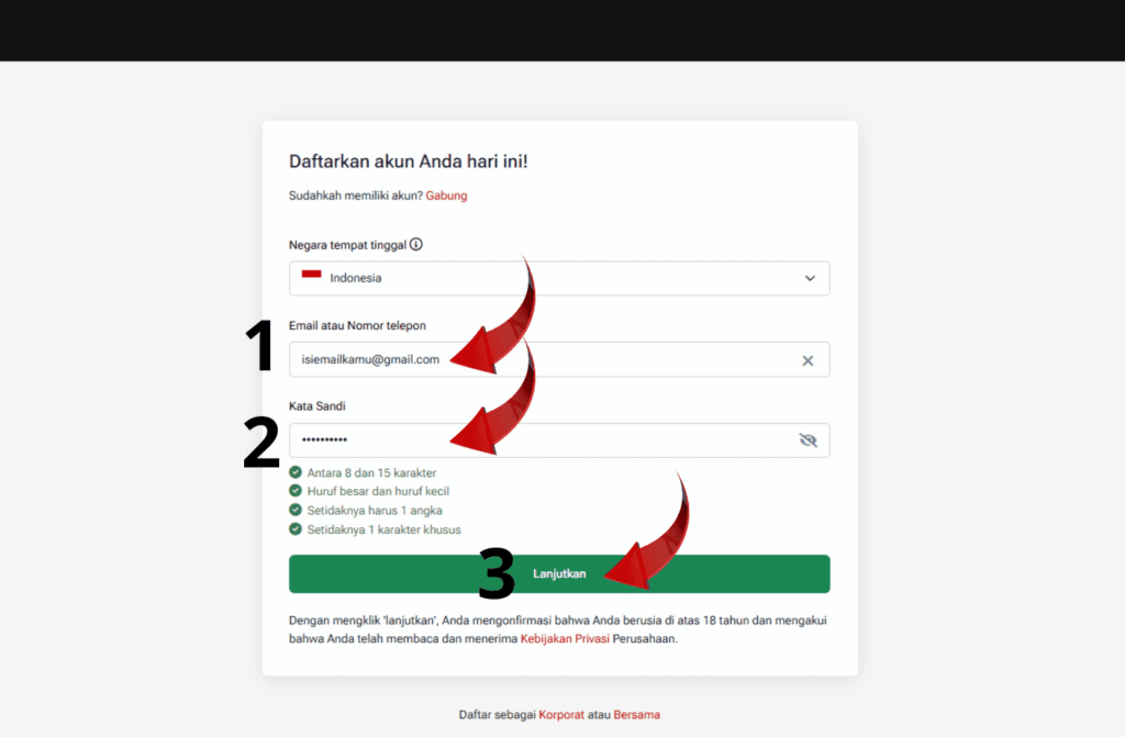 Pastikan password Anda aman: gunakan kombinasi huruf besar, huruf kecil, angka, dan simbol, lalu klik tombol “Lanjutkan”.