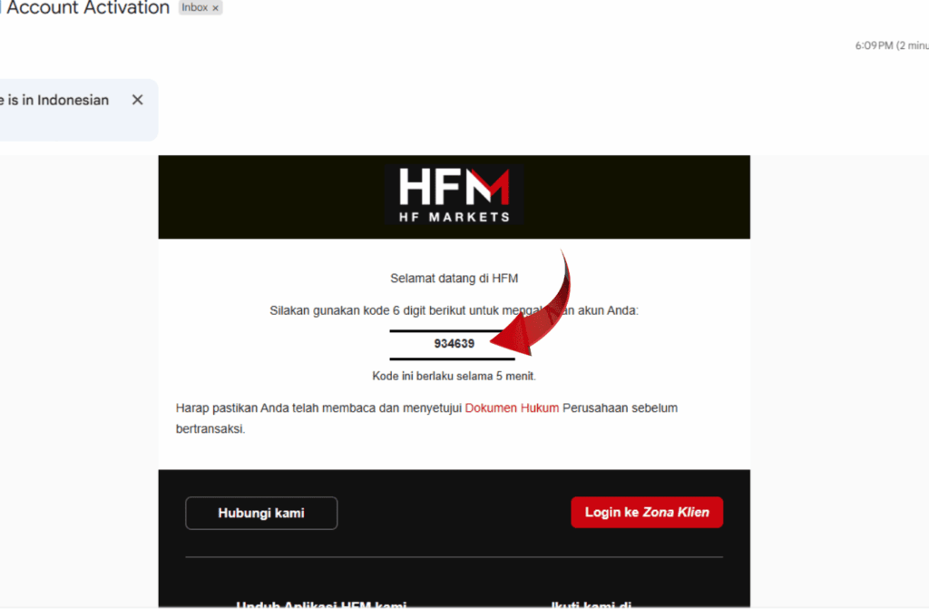 Setelah klik daftar, cek inbox email Anda. HFM akan mengirimkan kode verifikasi.