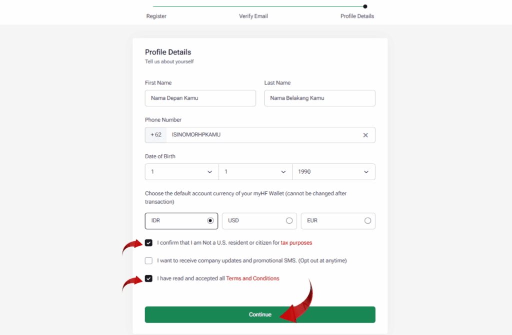 Setelah verifikasi email sukses, langkah terakhir adalah melengkapi profil Anda. Isi data-data pribadi yang diminta untuk pembukaan akun. Setelah semua kolom terisi, setujui syarat dan ketentuannya sekali lagi, lalu klik tombol “Continue”. Jika kamu bingung untuk pilihan mata uang, kamu bisa pilih IDR.
